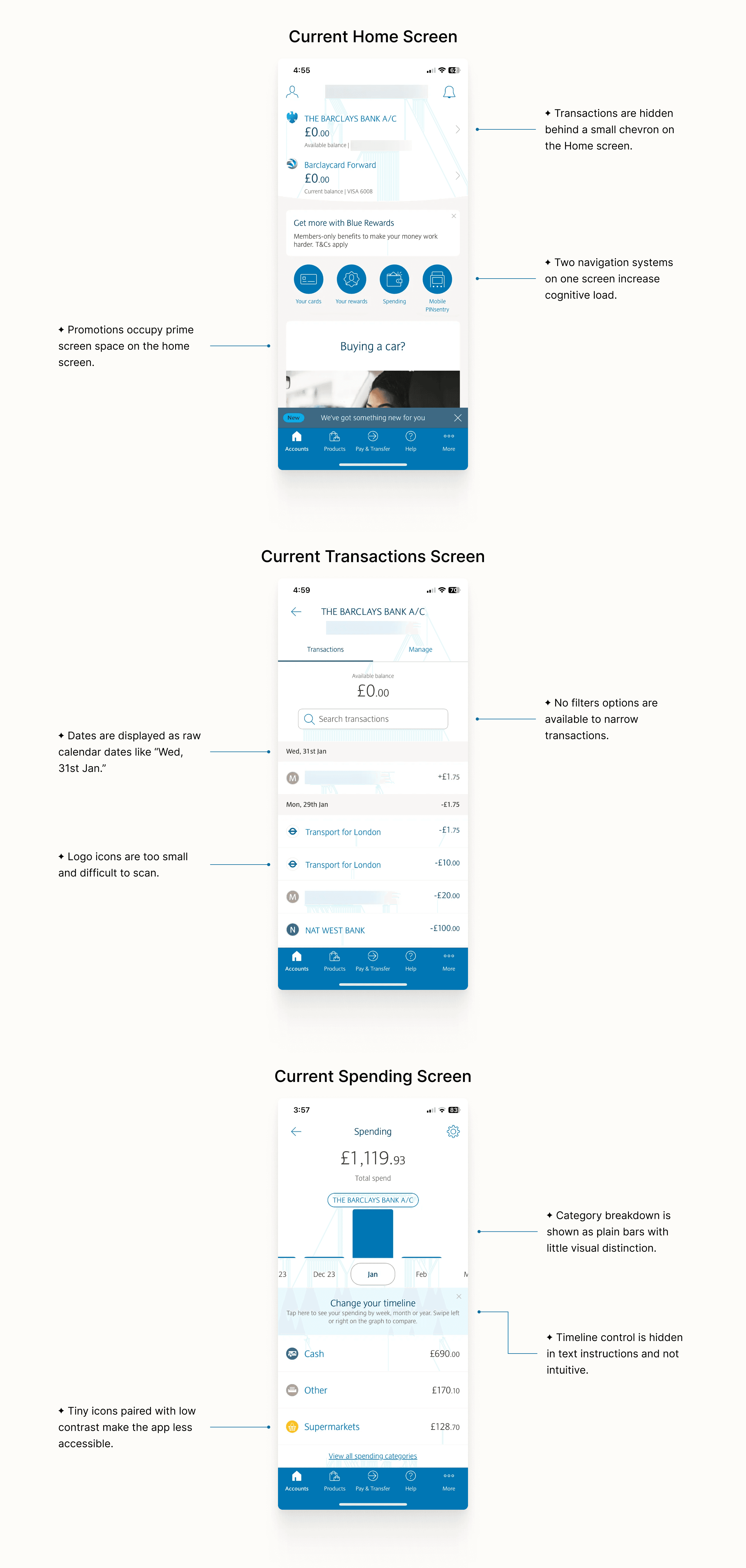 Barclays is one of the UK’s largest banks, serving millions of customers through its mobile app. Despite its popularity, user reviews often highlight frustrations around cluttered navigation, hidden actions, and limited spending insights. This made it an ideal candidate for a redesign that focuses on usability and clarity.