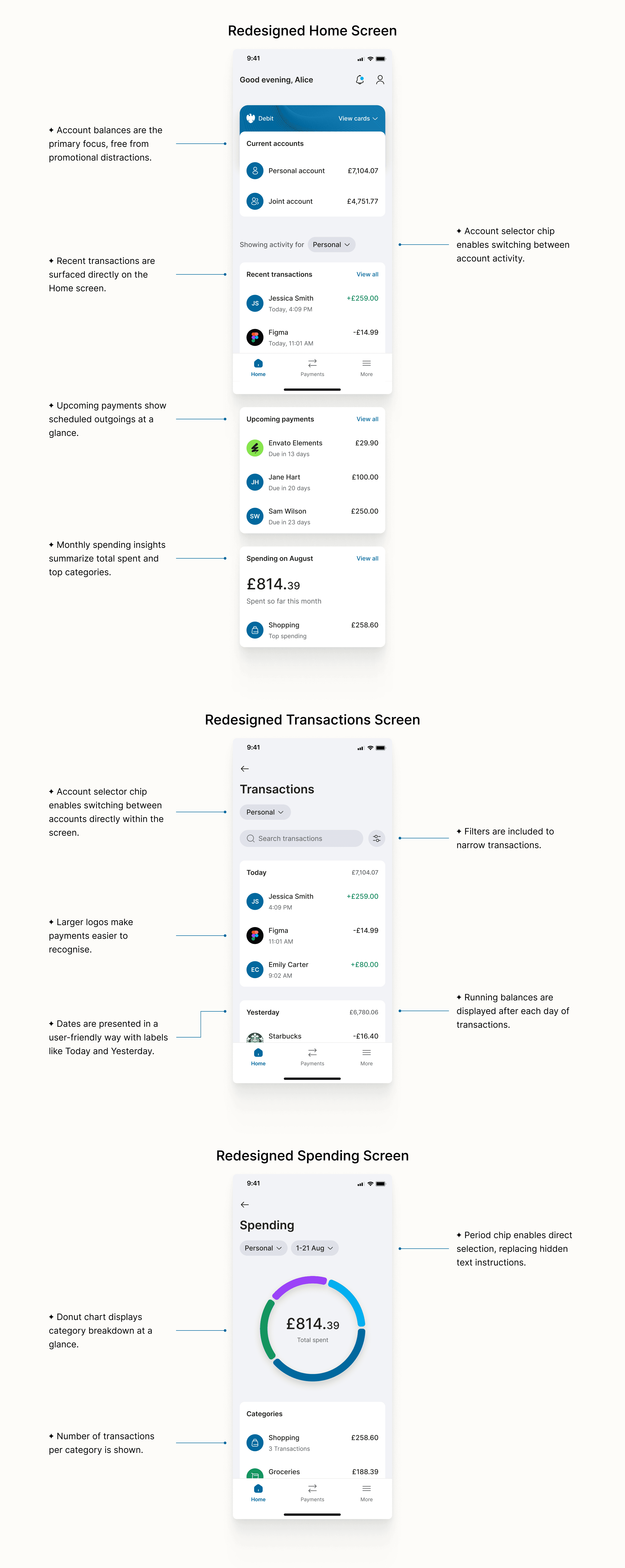 In contrast, my redesign flattens this hierarchy by surfacing account activity directly on the Home screen. This reduces navigation friction, particularly for users managing multiple accounts. However, some users may prefer the traditional model, where each account has a clearly defined “home.”